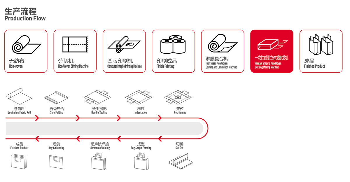 該機適用于原材料為無紡布,覆膜無紡布,專業(yè)生產(chǎn)一次成型覆膜的立體袋(免翻),設備生產(chǎn)穩(wěn)定,袋子熱合部位牢固,美觀、大方,可反復利用,主要用于生產(chǎn)無紡布煙、酒包裝袋,無紡布飲料包裝袋,禮品袋,酒店廣告袋等無紡布袋,該機集機電為一體,運用LCD觸摸屏操作。配以步進步式定長,光電跟蹤,電腦自動定位,電腦自動糾邊,準確,平穩(wěn),自動計數(shù),即可設定計數(shù)報警,自動燙把手,自動疊袋等工控裝置。